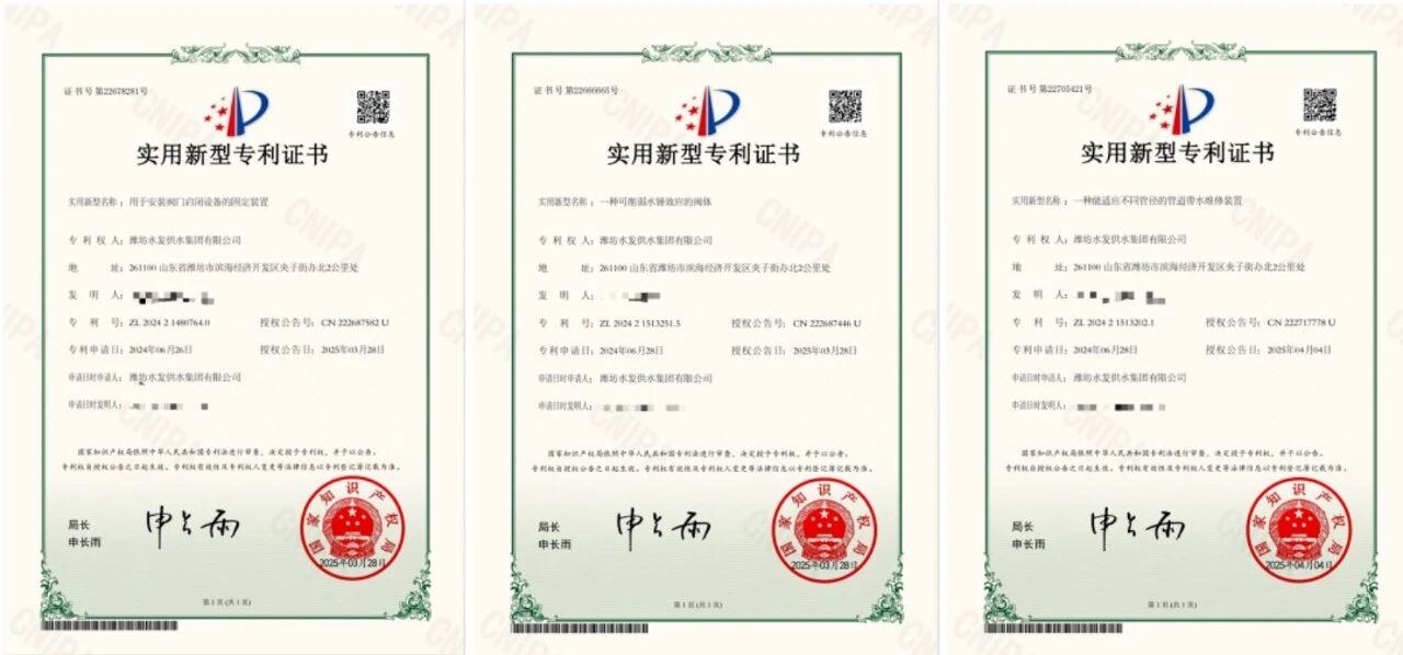 此外,濰坊區(qū)域還新增3項(xiàng)實(shí)用新型專利,涵蓋設(shè)備安裝、系統(tǒng)防護(hù)與維修維護(hù)等多個(gè)應(yīng)用場景:《用于安裝閥門啟閉設(shè)備的固定裝置》提升了復(fù)雜環(huán)境下的施工效率;《一種可削弱水錘效應(yīng)的閥體》增強(qiáng)了供水系統(tǒng)穩(wěn)定性;《一種能適應(yīng)不同管徑的管道帶水維修裝置》實(shí)現(xiàn)了高效不停水維修。三者與前述發(fā)明專利、軟著協(xié)同發(fā)力,初步構(gòu)建起“檢測-控制-維護(hù)”的水務(wù)管網(wǎng)技術(shù)創(chuàng)新體系。